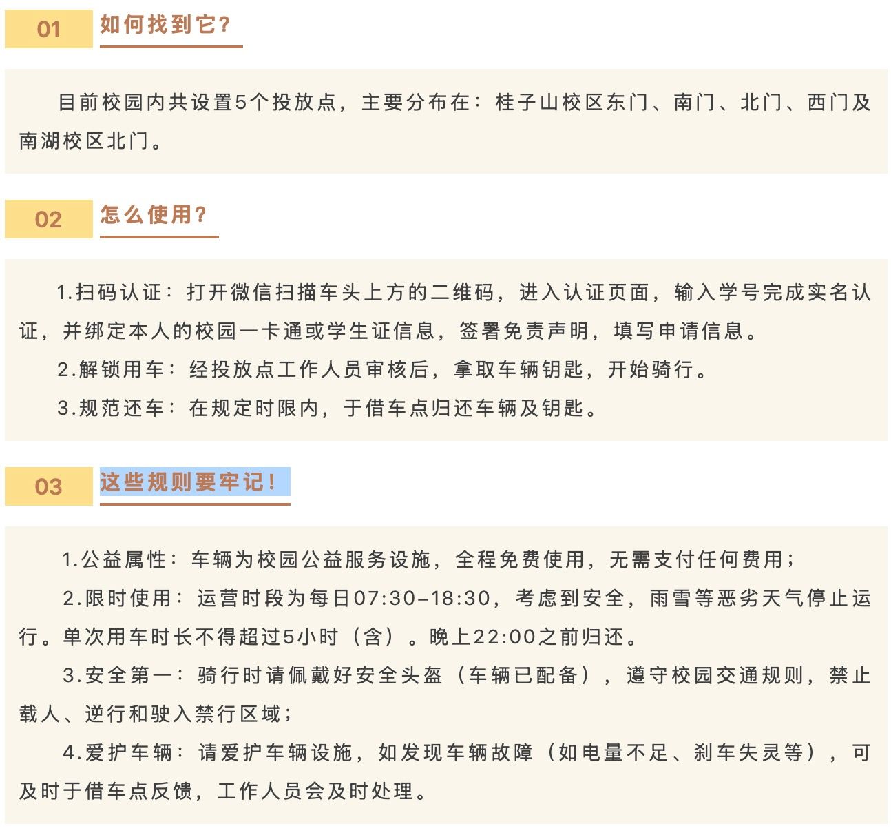 安全是项目运行的首要前提。学校实行实名注册、限时骑行、定点停放的管理制度,有效保障用车安全与秩序。所有投放车辆均通过3C安全认证,并统一配备安全头盔与骑行提示。