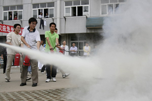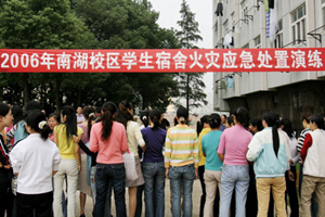 其实这次“火灾”现场并不存在,而是06年南湖校区学生宿舍火灾应急处置模拟演练的现场。20名逃生人员是由宿舍管理中心的学生装扮而成。演练现场,保卫处的付老师向现场的100多名学生讲解初期火灾的扑救以及报警、逃生、自救的基本知识,并且演示了灭火器和室内消防栓、水袋、水枪的安装使用方法。随后,学生和宿管工作人员进行了木堆起火和油盘起火的扑救演练。