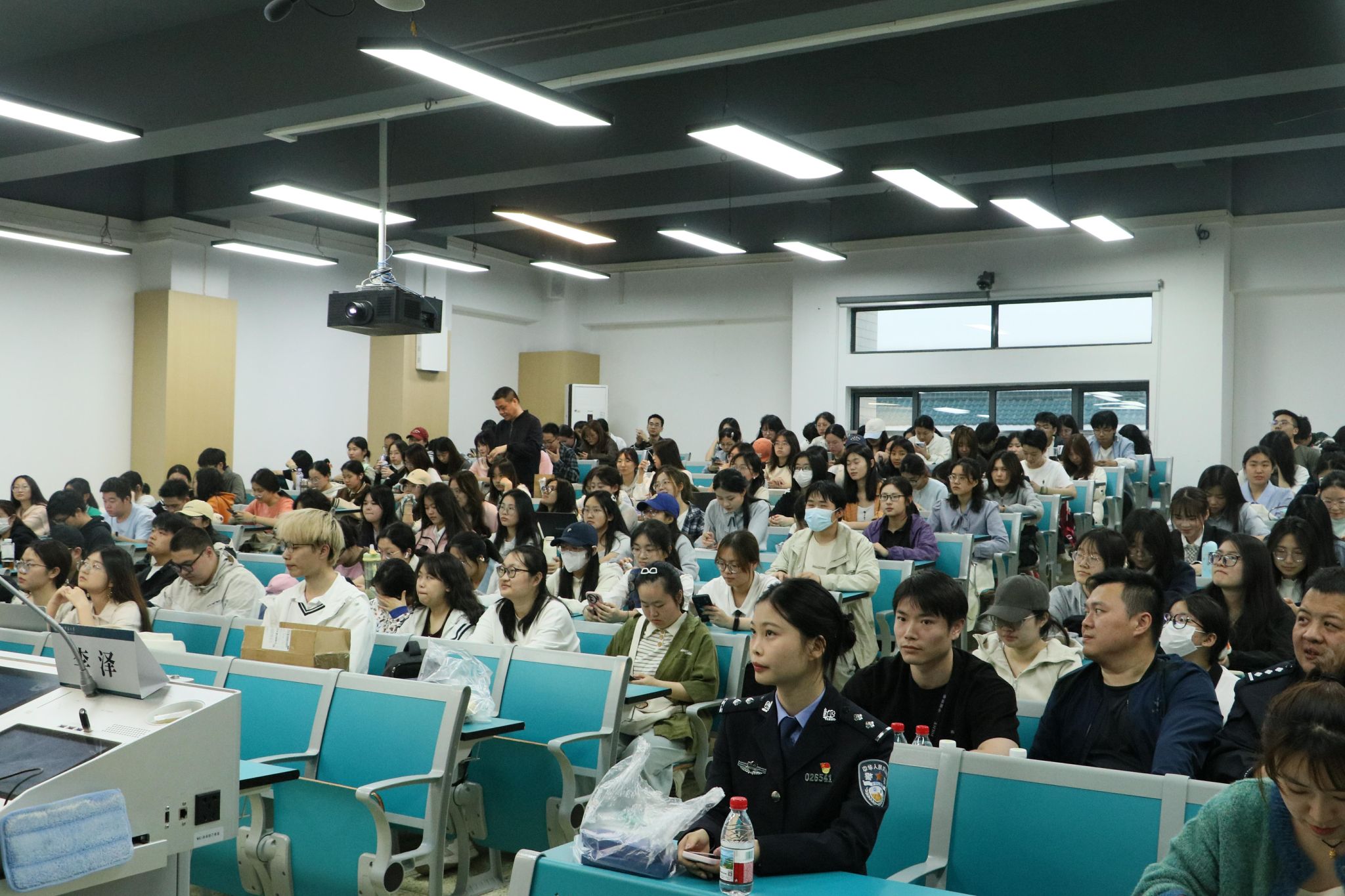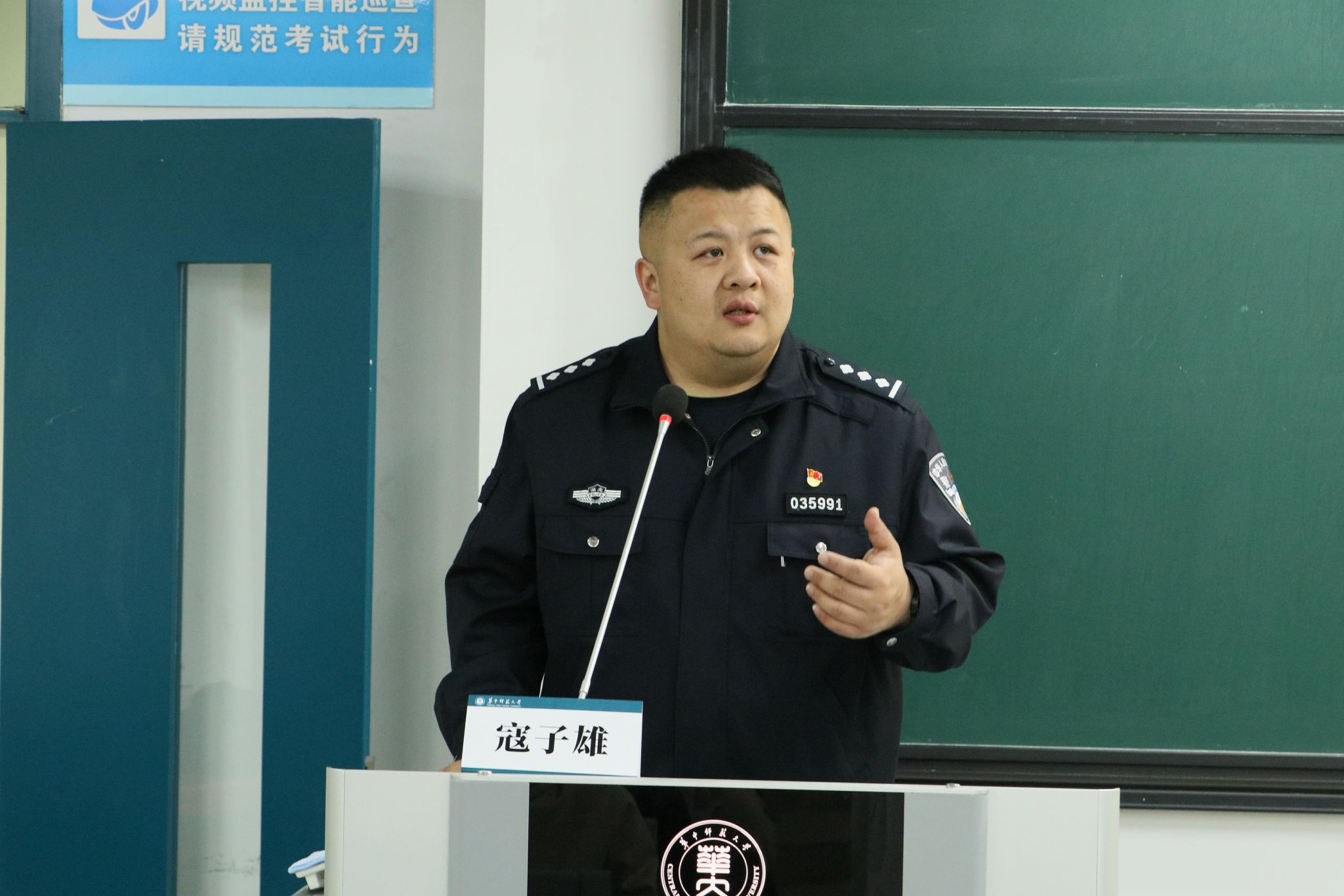 洪山分局民警寇子雄首先进行题为《如何识恐防恐》的主题讲座。寇警官聚焦“恐怖主义离我们有多远”“筑牢校园防火墙”“理性青年 安全卫士”三大板块,以真实案例为切入口,为2023级学生带来一场具专业性与实用性的硬核安全课。