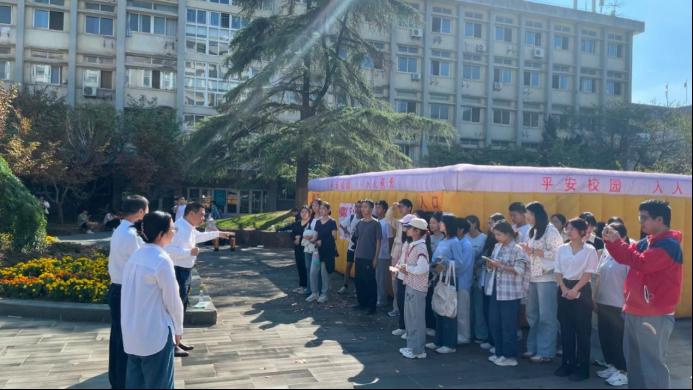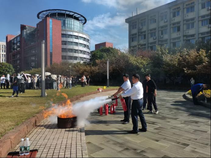 活动第二项,学校保卫处消防专员向与会师生就消防安全知识、火灾逃生自救知识和技能等内容进行讲解。首先,消防专员对实体灭火器和虚拟仿真灭火器进行了实操演示并讲解操作口诀要点:一拔,二握,三瞄,四扫;接下来展示并讲解灭火毯的使用方法和适用情况;最后消防专员深入浅出地讲解了遇到火灾时的基本逃生知识和安全逃生技能,演示了模拟疏散逃生体验馆的使用方法。本项活动通过实操的方式,让每位参与者都能熟悉和掌握基本的灭火技能。