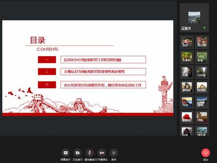 吴俊文主任首先回顾了我办疫情防控工作情况。他说,自1月21日学校召开新型冠状病毒肺炎防治工作委员会,成立“华中师范大学新型冠状病毒感染的肺炎疫情防控指挥部”以来,我校便全方位投入到疫情防控中,我办接到学校疫情防控工作任务后,单位领导班子第一时间紧急召开了视频工作会议,讨论开展学校疫情防控工作和开学信息化服务保障工作的方案及具体措施,进一步落实有关工作要求;成立疫情防控信息化保障领导小组和网络保障组、系统保障组、体温检测与门禁系统平台统筹建设组等具体工作小组,信息化办的全体成员充分运用信息技术手段为学校疫情防控工作做好了保障支撑,并得到了学校的一致认可和肯定,在此向积极奋斗和坚守在岗位的老师们表示感谢。