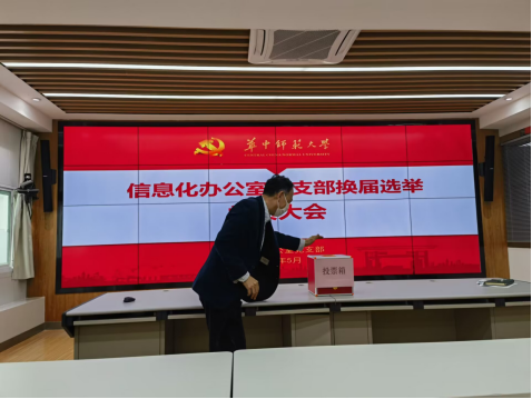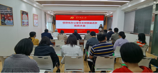 2023年5月11日上午,华中师范大学信息化办公室党支部换届选举大会在田家炳楼八楼指挥大厅进行,全体在职党员参会,退休党员吴俊文、罗时元、鲍裕功出席,会议由党支部书记吴绍靖同志主持。会议伊始,由刘合富清点党员出席人数,人数确认完毕后全体起立,奏唱国歌。