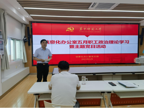 接着,吴绍靖书记作支部书记讲党课系列专题报告,吴绍靖书记以《推进教育数字化•助力教育高质量发展》为主题从机遇与挑战、研究与实践、变革与展望三个方面进行介绍。他指出,互联网、大数据、云计算、人工智能、区块链等数字技术创新活跃,数据作为关键生产要素的价值日益凸显,深入渗透到经济社会各领域全过程,新一轮科技革命和产业变革深入发展,数字经济成为发展的新引擎,数字经济发展必然对数字教育提出要求,教育数字化已成为国内外的共识,人才培养体系亟待重构。他以华中师范大学为例,从数字化助“学”、数字化助“教”、数字化助“管”、数字化助“研”四个维度介绍了学校推动教育数字化转型的相关举措、成效。他谈到,教育信息化建设向纵深发展,以“数字化课堂”形式构建开放便捷的教学环境、赋能高等教育创新发展成为必然趋势,信息化工作要以业务融合为入口,积极推动业务数字化,不断拓展数据维度,构建更加全面的数据体系,努力促进学校建设,助力学生全面发展。
