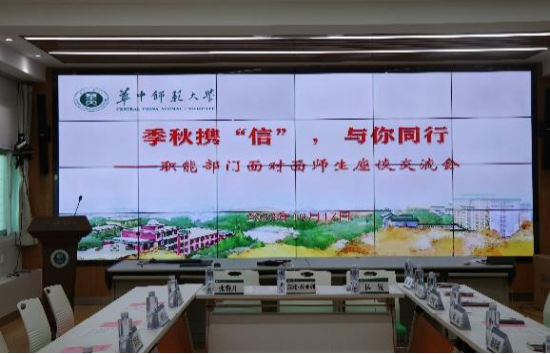 2023年10月17日,由华中师范大学信息化办公室、华中师范大学研究生会主办,华中师范大学文学院研究生会承办的“季秋携‘信’,与你同行——职能部门面对面师生座谈交流会”在华中师范大学田家炳楼8楼指挥大厅举办。信息化办公室主任吴绍靖,副主任谭冬霞、刘爱民,黄红涛、唐亦非、夏欣、江迎春等相关业务部门老师出席交流活动并回答学生提问。研究生会生活服务中心成员、各学院本科生、研究生代表参与交流活动。活动由文学院研究生会成员苏比·孜亚顿主持。