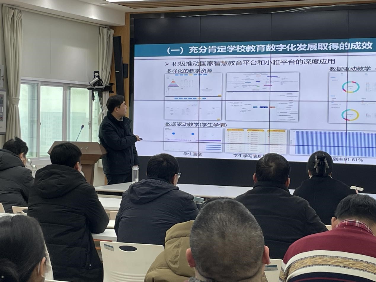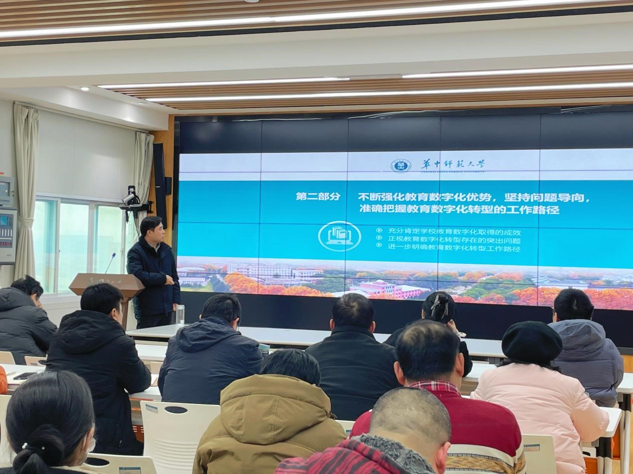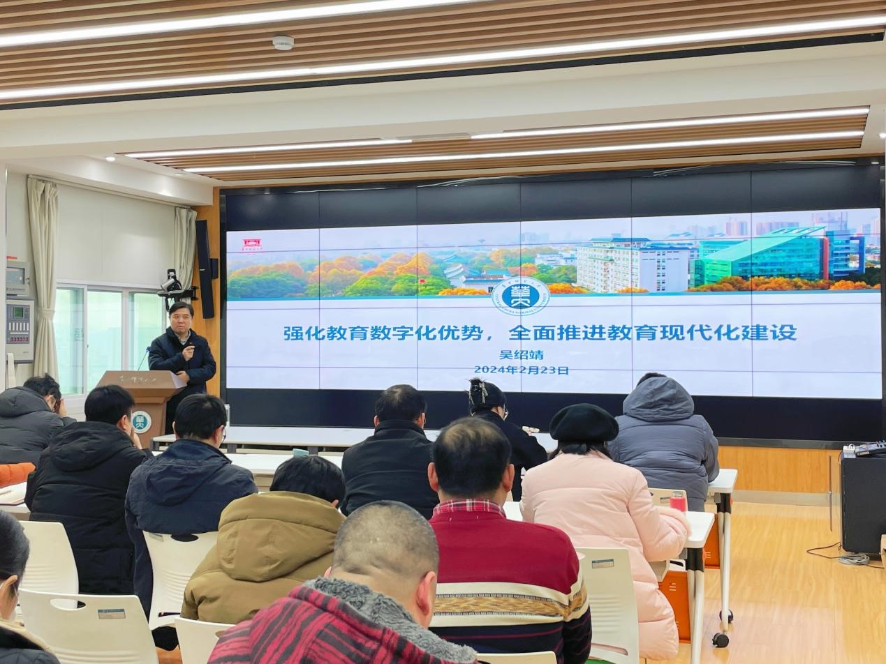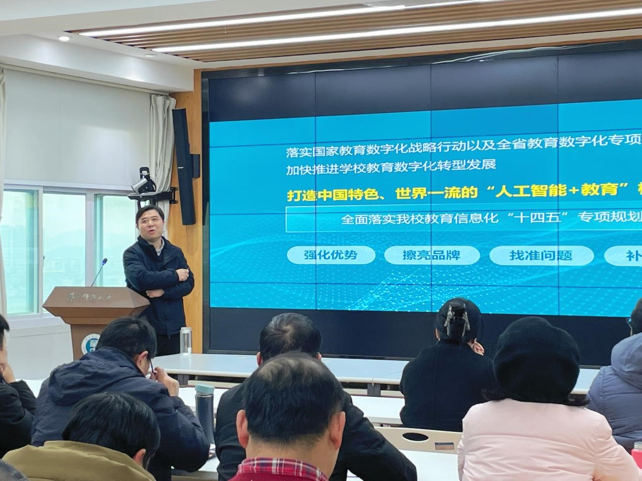 接着,吴主任结合学校新学期工作部署,作“强化教育数字化优势,全面推进教育现代化建设”报告。在报告第一部分,吴主任从中央政治要求、产业变革需求、历史发展规律、教育改革形式、区域发展机遇五个方面介绍了学校推进教育数字化转型的时代机遇与挑战,号召全体职工不断增强数字化转型的责任感与使命感。