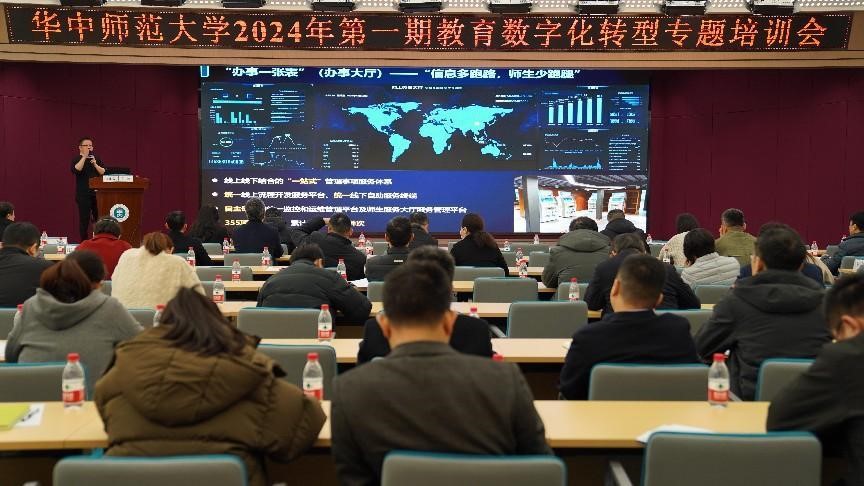 3月8日上午,信息化办公室在文科科研楼一楼报告厅举办华中师范大学2024年第1期教育数字化转型专题培训会。华中科技大学网络与信息化办公室副主任吴驰作专题报告,信息化办公室主任吴绍靖主持会议。学校各单位领导、信息化工作联络员和信息化办公室工作人员等共150余人参与培训。