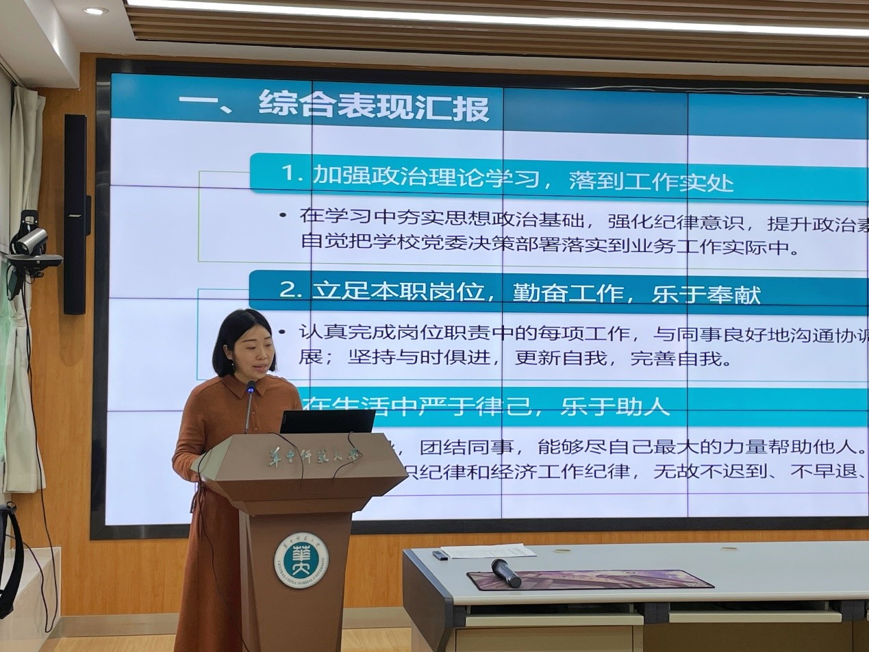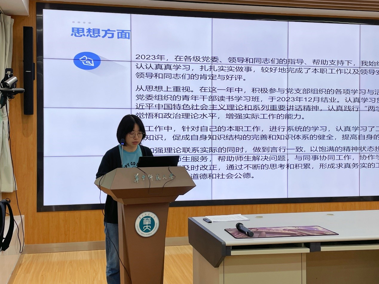 会议上,九名候选人老师依次进行述职汇报,对过去一年的工作进行了全面细致的梳理,总结了自己在2023年的工作成就、存在的不足并对下一步工作进行了展望。全体与会人员认真倾听了九位老师的述职报告。