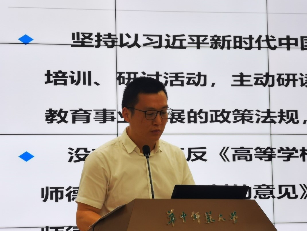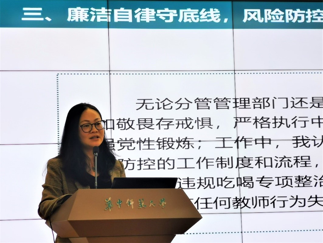 同时,在会上吴绍靖传达了《中共华中师范大学委员会关于开展党纪学习教育的实施方案》以及“关于做好“五一”期间正风肃纪要求的通知”的精神,要求全体教职工从扎实开展学习、加强警示教育、加强解读培训、开好民主生活会和组织生活会四个方面出发,同时要深入学习《中国共产党纪律处分条例》,切实把党纪学习教育成效转化为学校高质量发展成果,强调全体职工要高度重视学校安全稳定工作,持续增强维护校园安全稳定工作的责任感和紧迫感。