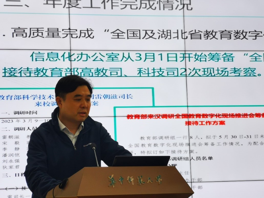 会议开始,吴绍靖代表信息化办公室的领导班子进行述职汇报,吴绍靖对2023年信息化办公室领导班子的工作从强化理论学习、坚定理想信念,落实全面从严治党和党风廉政建设,年度工作完成情况等三个方面进行了总结,全方位展示单位在2023年度取得的成绩,并表示新的一年将再接再厉,主动谋划学校教育数字化转型工作,积极对标学校教育数字化转型行动计划,深度对接第三届世界数字教育大会,充分展示学校数字教育新成果,为学校事业高质量发展作出新的更大的贡献。