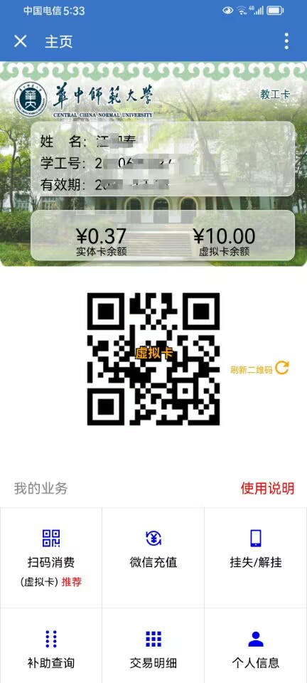 如需给虚拟卡充值,请点击二维码下方的“微信充值”,选择“充值到虚拟卡”,虚拟卡充值实时到账,充值后即可消费。
