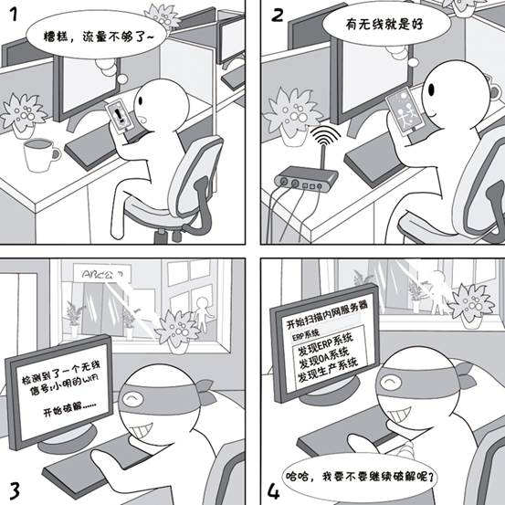 无线路由器有较多的安全隐患,比如,之前的WEP认证能很轻易破解。个人架设无线路由器,如果配备不当会导致蹭网或个人资料泄露,在公司使用可能导致内网被入侵,公司机密、客户资料泄露,后果不堪设想。