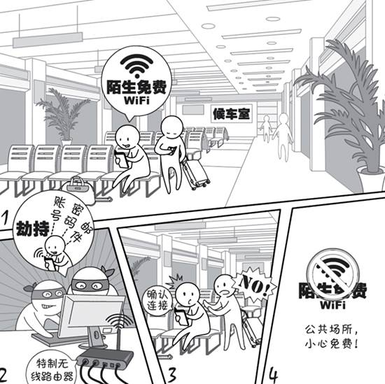 比如,黑客自己搭建一个“山寨WiFi”,取一个与附近WiFi相似的名字,不设登录密码诱导人们连接。使用时,传输的数据就会被黑客监控,个人隐私、账号名和密码等信息,也可以轻易被盗取。其实,不仅是蹭WiFi,不少人还喜欢随时开着手机无线网自动连接功能,这样风险就更大了。