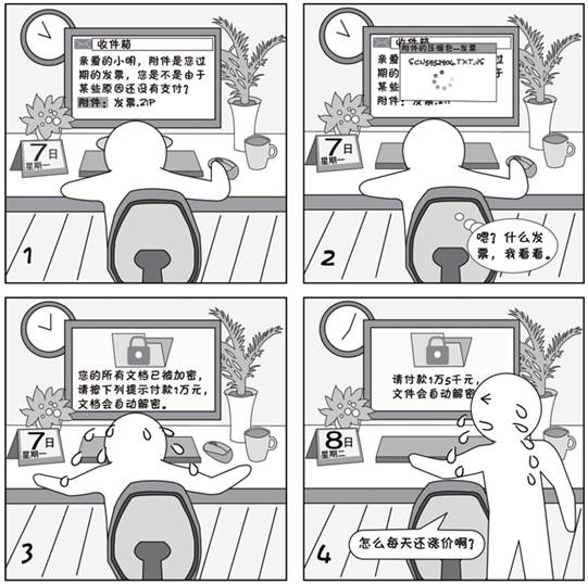 流行的勒索病毒邮件多为英文邮件,主题和正文诱导用户打开附件。这种病毒对文档的加密强度很高,可以说是无法破解,只有付款才能解密文档。