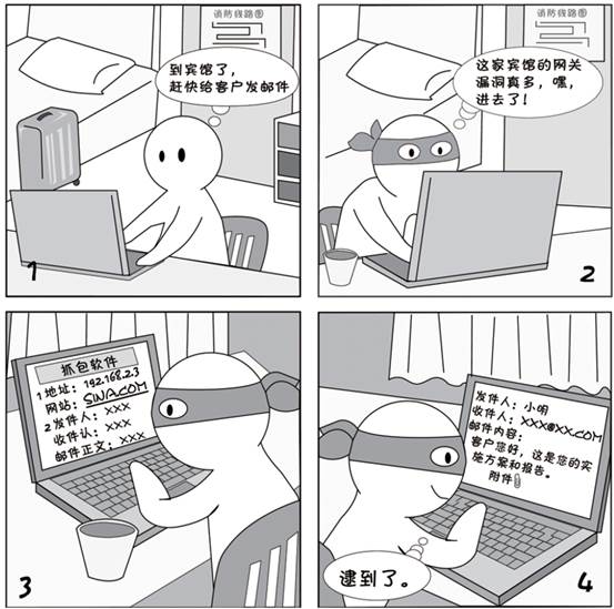 一些宾馆或公共网络的安全性较差,黑客很容易入侵到其网关设备并监控网络流量,如果收发邮件没有加密,黑客抓到这些数据包后很容易还原出邮件正文和附件。