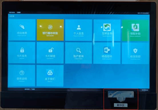一卡通自助设备包含圈存机和自助补卡机两类。圈存机共有20台,主要功能有:个人信息查询、挂失解挂、补助领取、扫码充值等。自助补卡机共有7台,主要是给师生提供自助补卡功能。