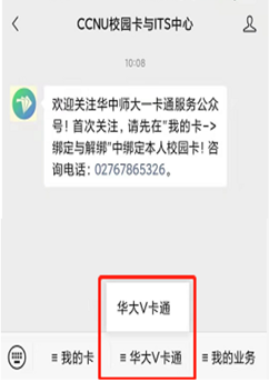 方法二:通过校园卡微信公众号进入。打开个人微信,在通讯录——>公众号——>搜索并关注“CCNU校园卡与ITS中心”(微信号:ccnuecard),绑定个人卡片信息后即可体验新模块“华大V卡通”功能了(如下图)。