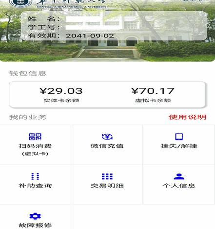 进入“华大V卡通”后,可显示以下信息:个人信息、钱包信息、扫码消费、微信充值、挂失解挂、补助查询、交易查询、故障报修、消费信息提醒、使用说明等。
