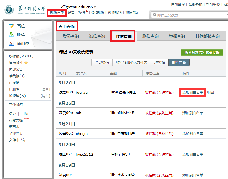 如果你发现通知里拦截的邮件不是垃圾邮件而是你需要的重要邮件,可在邮箱首页——>自助查询——>收件查询中添加白名单,将发信人添加成白名单,以后系统就不会拦截此发件人发的邮件了。请点击下图所示: